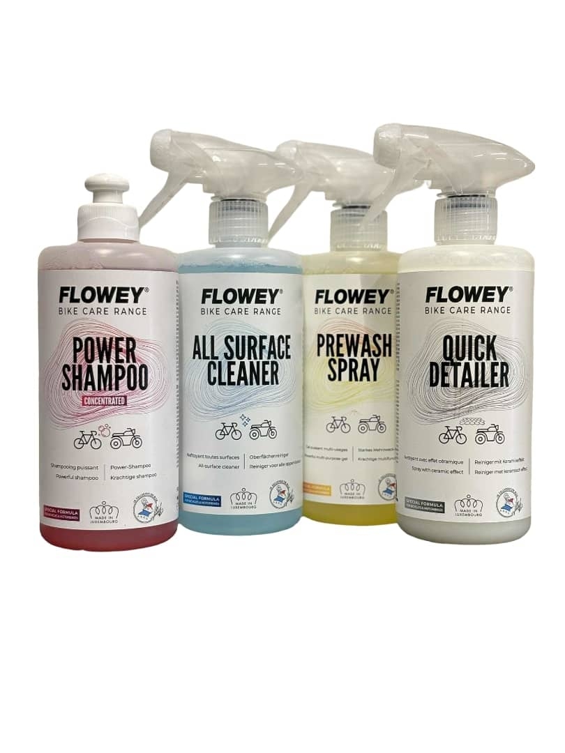 Flowey kaherattalise hoolduskombo on täielik hoolduslahendus mootorratastele, mopeedidele ja jalgratastele. Komplekt sisaldab kõiki vajalikke vahendeid, et puhastada sõiduk põhjalikult, taastada läige, eemaldada mustus ning jätta pinnad kaitstuks. Komplekti tooted sobivad kasutamiseks nii metallil, plastikul, värvipindadel kui ka muud tüüpi välispindadel. Kombo sobib nii igapäevaseks hoolduseks kui ka põhjalikumaks detailipesuks.