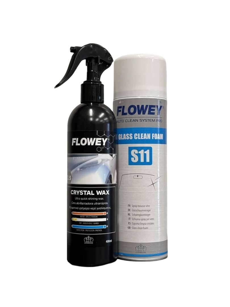 Flowey Quick Shine Duo on kiire ja lihtne hoolduskomplekt, mis annab autole koheselt puhta ja viimistletud välimuse. Komplektis olev S11 Glass Clean Foam on mõeldud klaaside ja pleksiklaasi puhastamiseks ning eemaldab tõhusalt mustuse, putukajäljed ja rasva, jättes klaaspinnad triibuvabaks ja kirkaks. Toodet pihustatakse otse klaasile, seejärel hõõrutakse pind mikrokiudlapiga ning pühitakse puhtaks kuiva, ebemevaba lapiga. Antistaatiline toime aitab hoida klaasid kauem puhtana. Kere viimistlemiseks kasutatakse 3.5 Crystal Wax’i, mis on kergelt mikroabrasiivne poleeriv vaha ja sobib eriti hästi uuemate sõidukite hoolduseks. Toode eemaldab värvipinnalt tuhmi loori ja mikroskoopilise mustuse, annab sügava peegelläike ning loob mustust hülgava kaitsekihi. Crystal Wax kantakse puhtale ja kuivale kerele mikrokiudlapiga ringjate liigutustega ning poleeritakse seejärel kuiva lapiga läikima. Tulemus on kohe nähtav – pind jääb sile, läikiv ja kergemini puhastatav. See kombo sobib ideaalselt kiireks auto värskendamiseks enne sõitu, müüki või igapäevaseks hoolduseks, kui soovid professionaalset tulemust ilma ajakuluka tööta.
